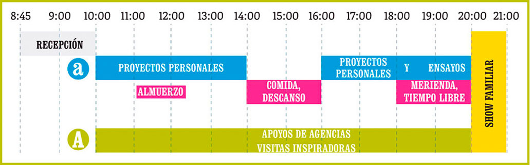 - 10,30-14,00. Desarrollo de los proyectos personales en las áreas. Cada participante escoge su momento de descanso a lo largo de la mañana con el fin de no interrumpir el fluir creativo de cada persona.
